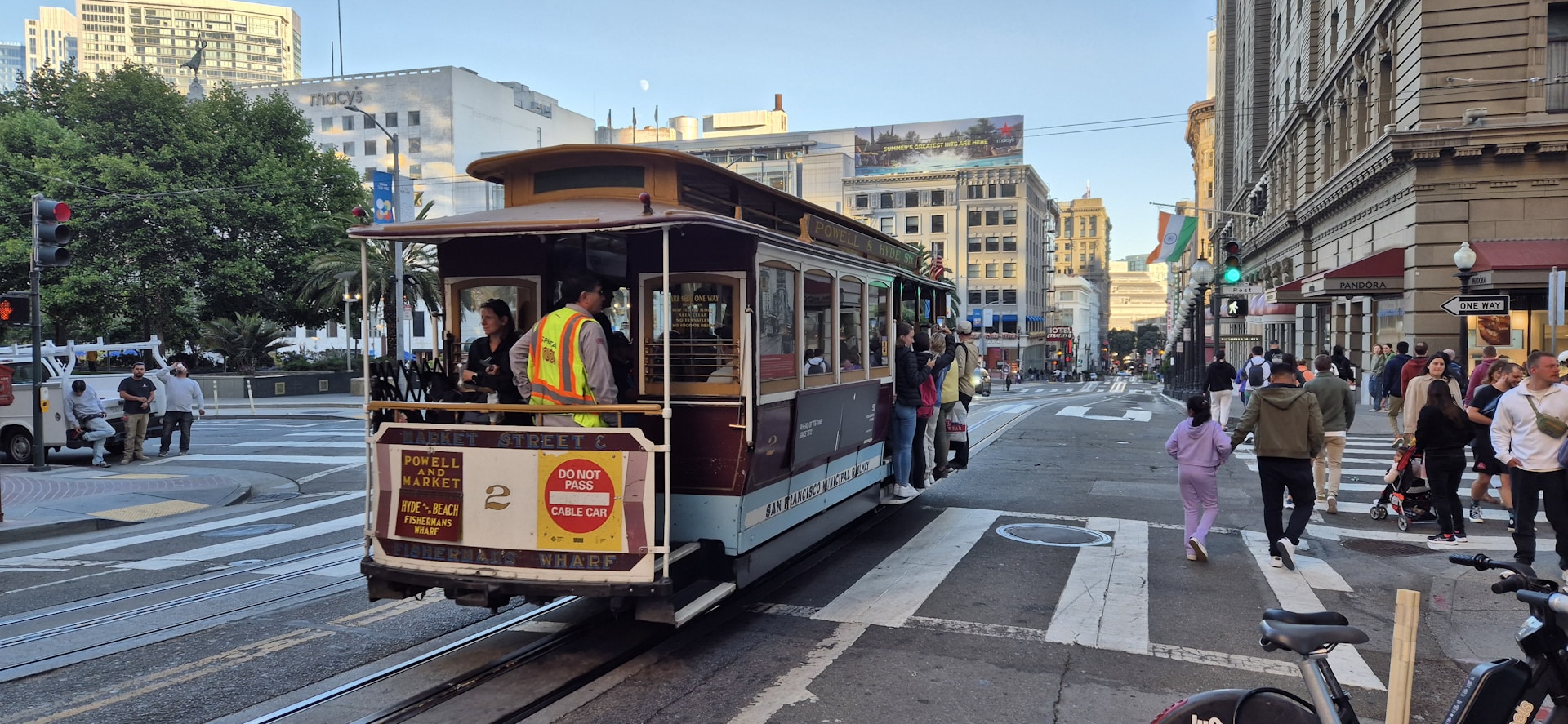 サンフランシスコを代表する交通手段として知られているのがケーブルカーです。坂道の多い街を走るレトロな車両は観光客にも人気があり、移動手段としてだけでなく観光体験のひとつとして楽しむことができます。