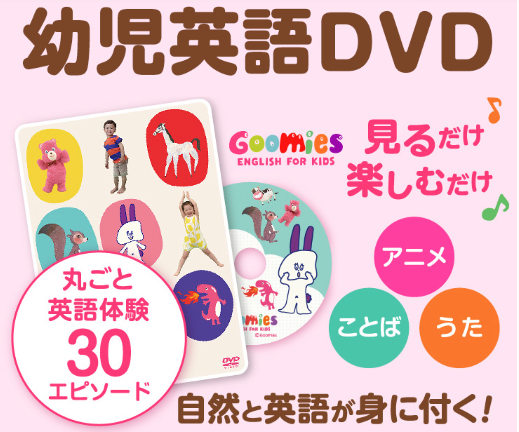 そのような家庭にとってGoomiesは、無理なく始めやすい選択肢のひとつです。アニメ・歌・日常で使いやすい英語表現を組み合わせた構成で、子どもが映像を楽しみながら英語の音やリズムにふれやすい内容になっています。幼児向け英語DVDとして知られ、0〜7歳向けの商品として流通している点も特徴です。価格の目安としては3,000円台後半で見られることが多く、比較的始めやすい教材です。:contentReference[oaicite:2]{index=2}