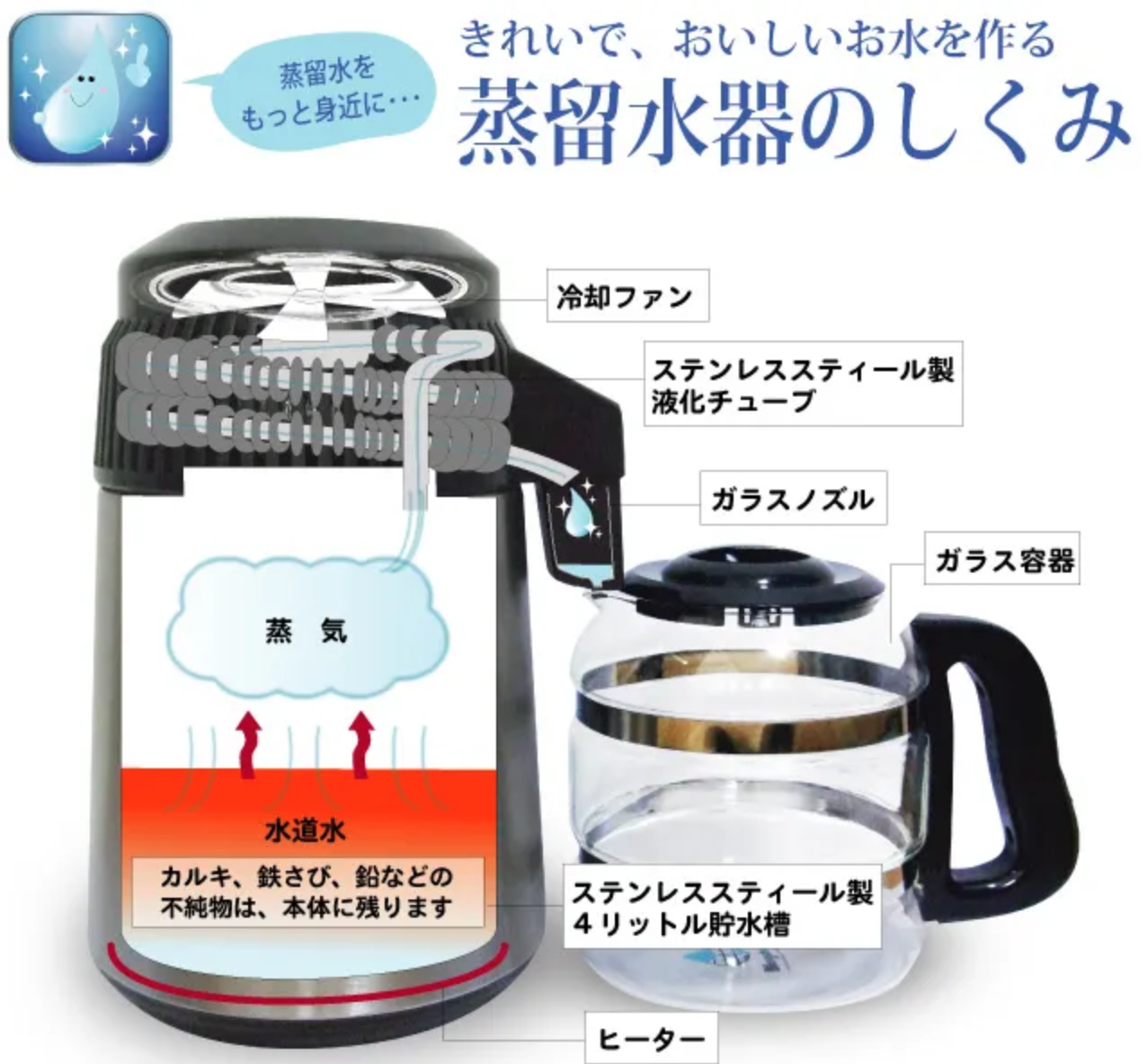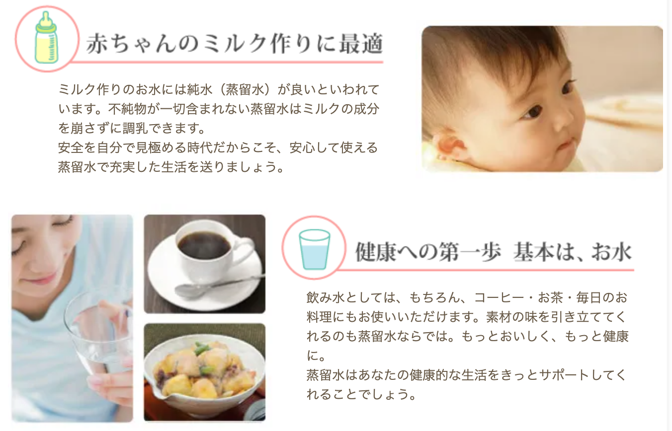 また、販売ページでは最大約4Lの蒸留水をつくれるタイプとして案内されており、飲用だけでなく、料理やコーヒー・お茶などに使いたい方にも検討しやすい仕様です。家族で使いたい方にとっても、一定量をまとめて準備しやすい点はメリットといえるでしょう。