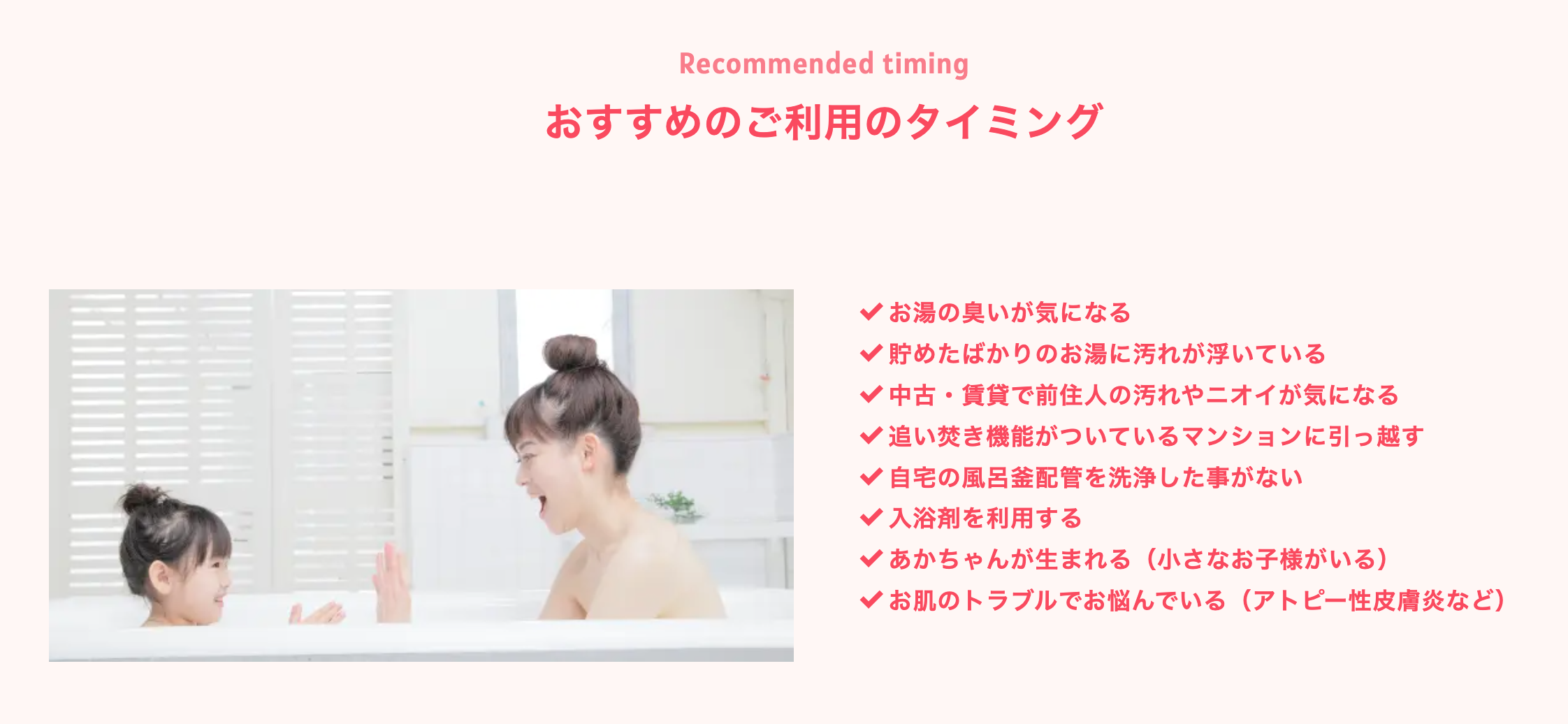 さらに、お風呂掃除の負担感を減らしたい方にもおすすめです。浴槽そのものは掃除していても、配管内部まではなかなか手が回らないことがあります。そうした「自分で管理しにくい部分」を任せられることで、日々の家事の中で見えない不安を減らしやすくなります。お風呂時間をより快適にしたい方にとって、見えない部分のメンテナンスは意外と大切です。